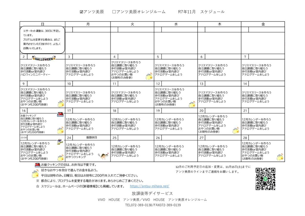 アンツ美原 11月のスケジュール表です。